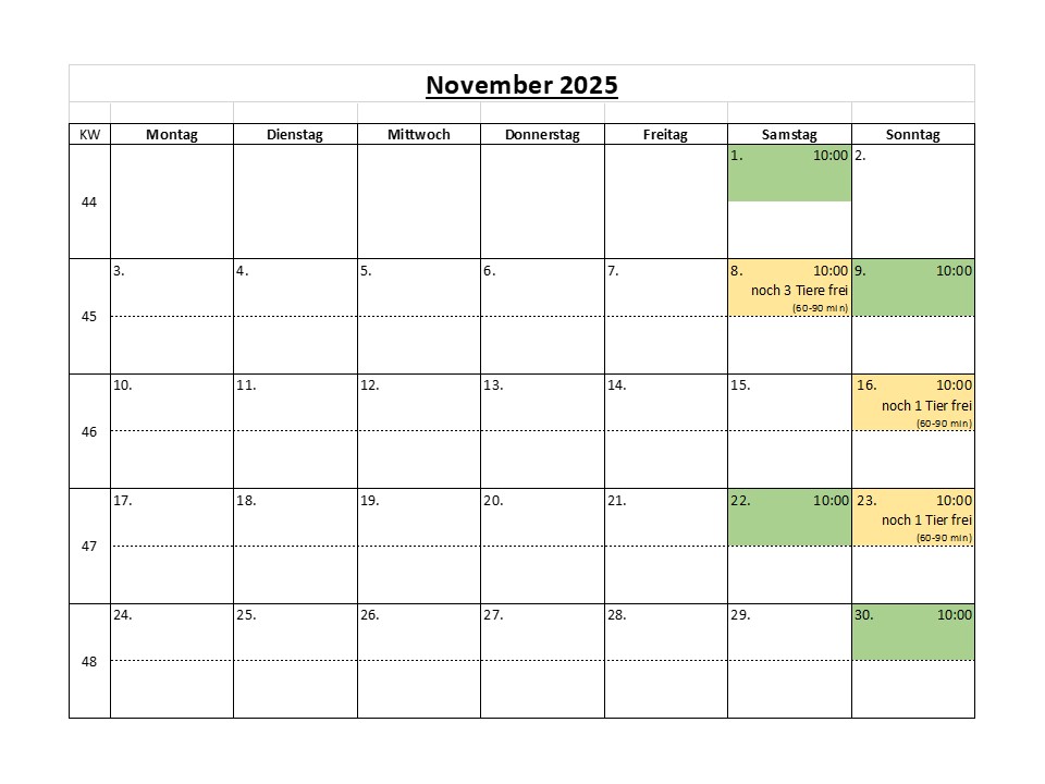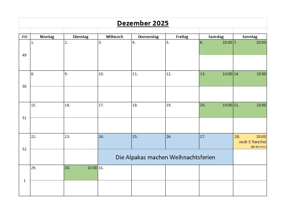 grüne Termine Hier können Sie völlig frei wählen, ob Sie die 30- oder die 60-90minütige Tour machen möchten und wie viele Alpakas Sie dabei begleiten sollen bzw. mit wie vielen Personen Sie kommen wollen.