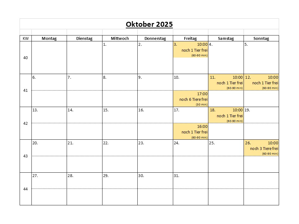 gelbe Termine Hier ist die Dauer der Tour bereits durch einen anderen Alpaka-Fan vorgegeben. Sie wird Ihnen zusammen mit der Anzahl der noch verfügbaren Alpakas angezeigt.