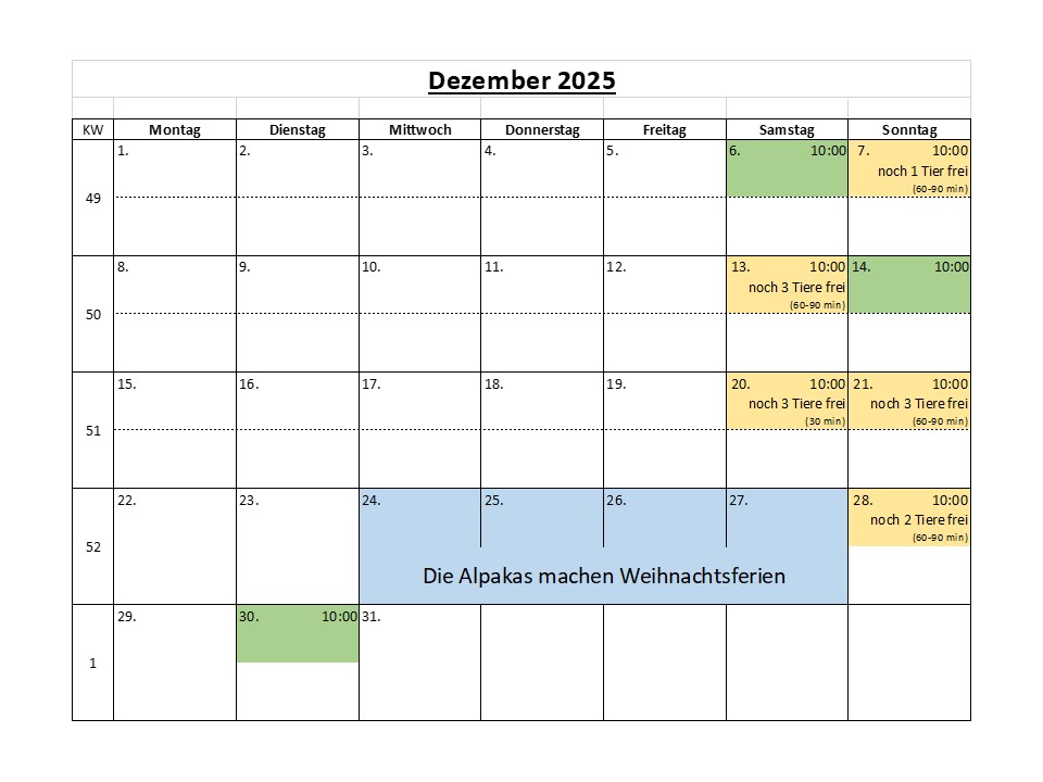 | gelbe Termine | Hier ist die Dauer der Tour bereits durch einen anderen Alpaka-Fan vorgegeben. Sie wird Ihnen zusammen mit der Anzahl der noch verfügbaren Alpakas angezeigt. |