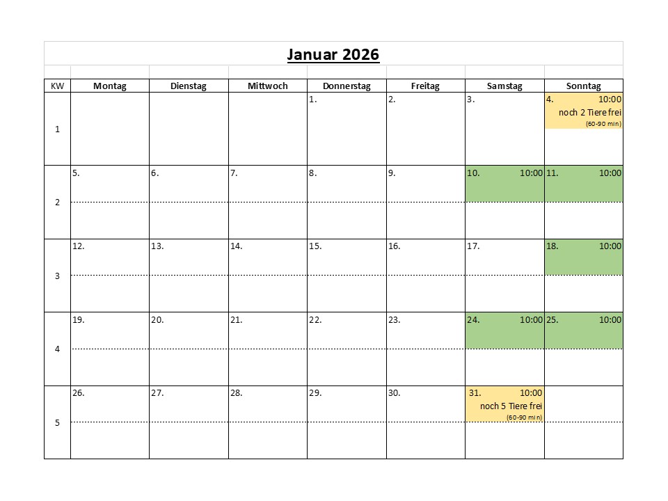| grüne Termine | Hier können Sie völlig frei wählen, ob Sie die 30- oder die 60-90minütige Tour machen möchten und wie viele Alpakas Sie dabei begleiten sollen bzw. mit wie vielen Personen Sie kommen wollen. |